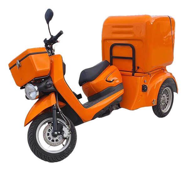 3-wheel electric cargo scooter with large lockable box, up to 120 km range, fast-charge port, and weather-ready roof for last-mile postal routes and hot food delivery.